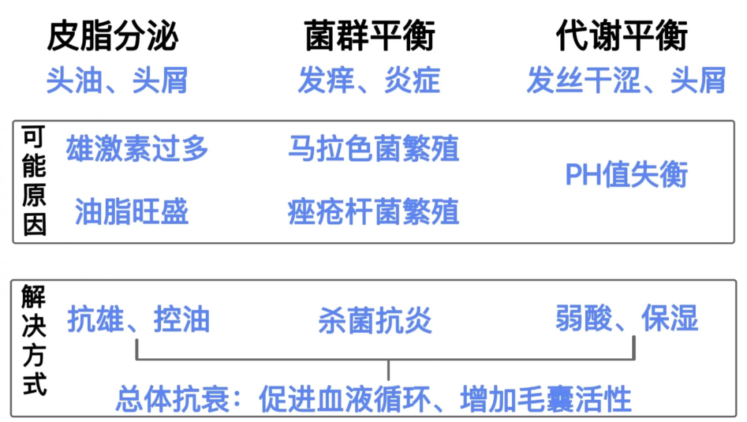 简单来说,头皮抗衰就是要根据自己的情况选择保湿、调节油脂、抑菌消炎、促进微循环、增加毛囊细胞活性等不同方向,来对症下药。