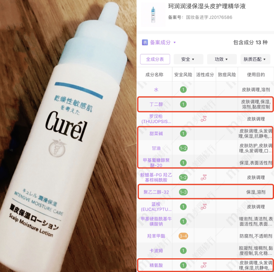 珂润的头皮补水乳液,一共13种成分,保湿成分就占了六种,可以说是一款很纯粹的头皮保湿精华,适合干性头皮,对于干燥起屑也有一定的作用。