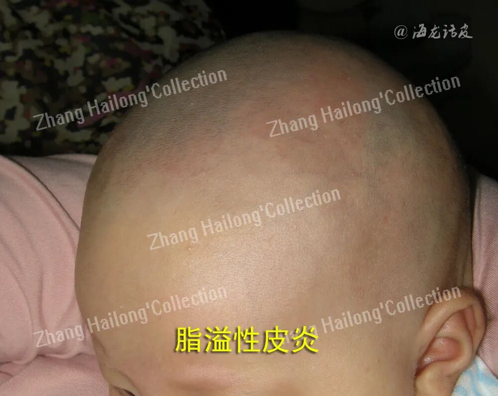 常在生后1周左右出现,可持续数月,症状轻微,为自限性疾病,多数在第一年内会自发消退。最初表现为轻度油腻性鳞屑附着于头顶及前囟区,可以扩散到整个头皮,严重者伴有糜烂渗出,最终可形成覆盖大部分头皮的白色、黄色或棕色鳞屑及黏着性厚痂,这种表现被称为摇篮帽。特别的是,有色人种的儿童通常无典型的摇篮帽,但有红斑,表皮剥落和色素减退的表现。