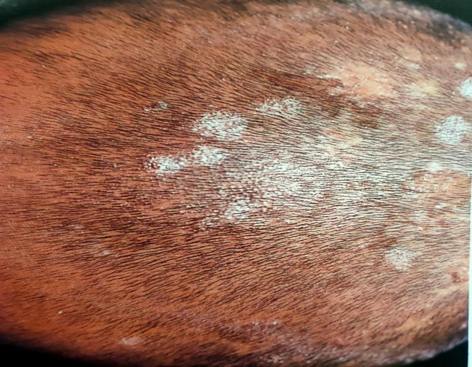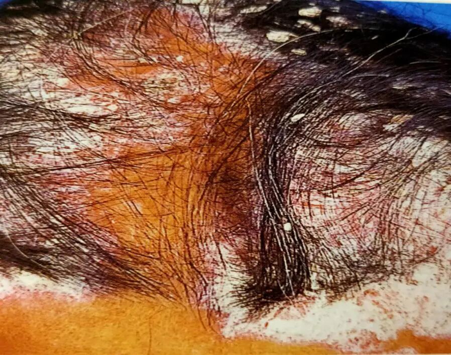 4.头皮的鳞屑非常厚,鳞屑呈干燥的粉末状,这种情况多半是头皮石棉状糠疹。