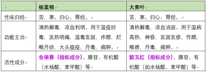虽然板蓝根和大青叶均来源于十字花科植物菘蓝,但板蓝根和大青叶的指标成分不同:板蓝根的指标成分为告依春,大青叶的指标成分为靛玉红。