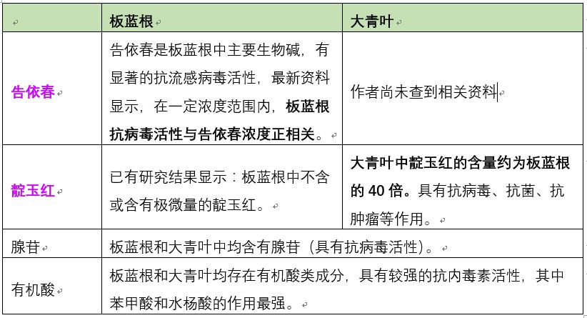 板蓝根和大青叶的抗病毒的功效是多个活性成分相互协同、共同作用的结果,包括告依春、靛玉红、腺苷和有机酸等。