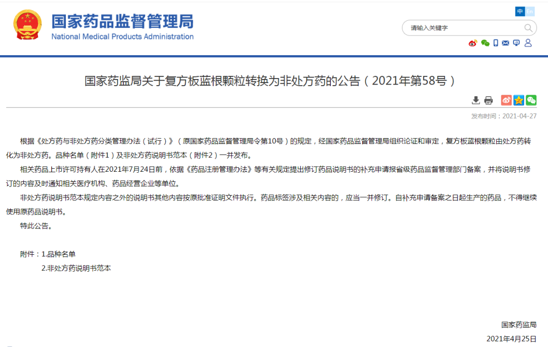 国家药监局关于复方板蓝根颗粒转换为非处方药的公告(2021年第58号)