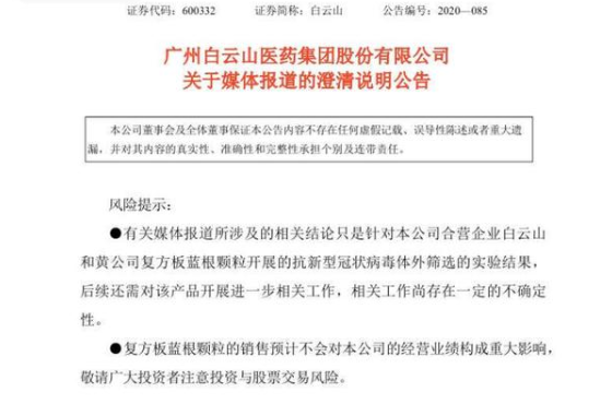 10月18日,广州白云山发布澄清公告称,有关媒体报道所涉及的相关结论只是体外筛选的实验结果,后续还需对该产品开展进一步相关工作,相关工作尚存在一定的不确定性。