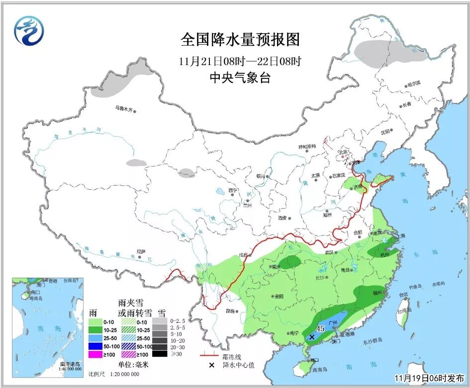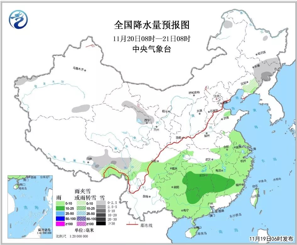 中央气象台预计,2018年11月20日08时至21日08时,甘肃河西、青海东北部、吉林中东部、辽宁东部、西藏东部等地的部分地区有小到中雪或雨夹雪。江淮大部、江南、西南地区东部、广西、广东西部等地的部分地区有小到中雨。新疆阿勒泰地区、河北北部等地的部分地区有5级~6级及6级以上风。