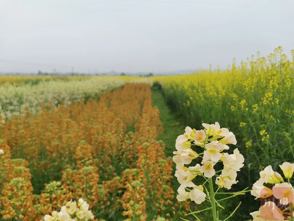 除了金黄,四川省农业科学院现代农业科技创新示范园内上百亩油菜还有纯白、桃红、米黄、浅橘等颜色,五彩斑斓。
