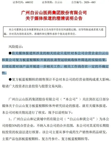 10月18日,广州白云山发布澄清公告称,有关媒体报道所涉及的相关结论只是体外筛选的实验结果,后续还需对该产品开展进一步相关工作,相关工作尚存在一定的不确定性。