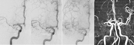 辅助检查:血常规、凝血功能、急诊生化均正常,免疫全项、甲功、血管炎抗体谱(-),心电图:正常窦性心律;心脏彩超:左室舒张功能稍减。头部MRI显示:右侧内分水岭区伴散在点状病灶。脑血管造影:右侧大脑中动脉(RMCA)狭窄、RMCA深穿支稀疏,右大脑半球的大部分由右大脑前动脉的软脑膜支反流供血。