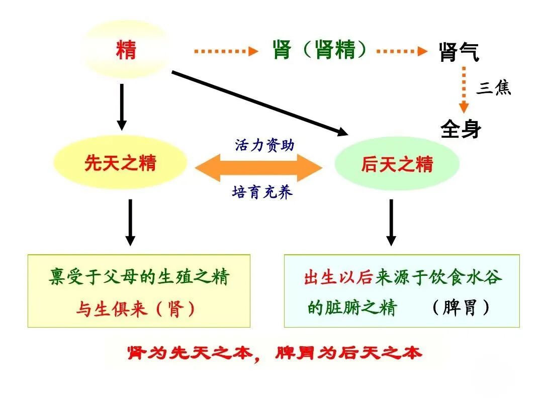 后天之精的化生,依赖于先天之精的资助,先天之精亦依赖于后天之精的补充,才不致耗尽。先天之精与后天之精是相互依存、相互补充、相互促进的,二者相辅相成,从而保证了肾精的充盛。先天之精与后天之精的来源虽然有异,但均藏于肾,二者是不能截然分开的。所以肾精的盛衰,除了和先天条件有关外,还和后天营养是否充盛有密切关系。
