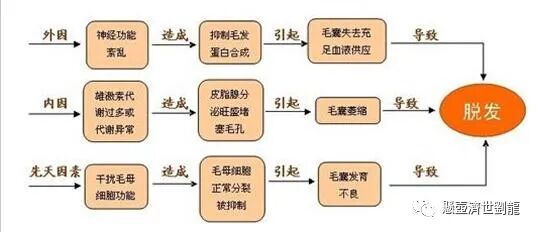 忧愁、污染、不良习惯等会使人体吸收、产生和积蓄大量毒素,这些毒素一方面破坏机体各器官、各系统,一方面影响机体各器官和和头发对养分的吸收,使各类滋补食品及及药物无法发挥作用,造成脱发。许多治疗脱发的方法效果不佳,是由于体内毒素未被清除之故,在此特别提出,以引起充分重视!