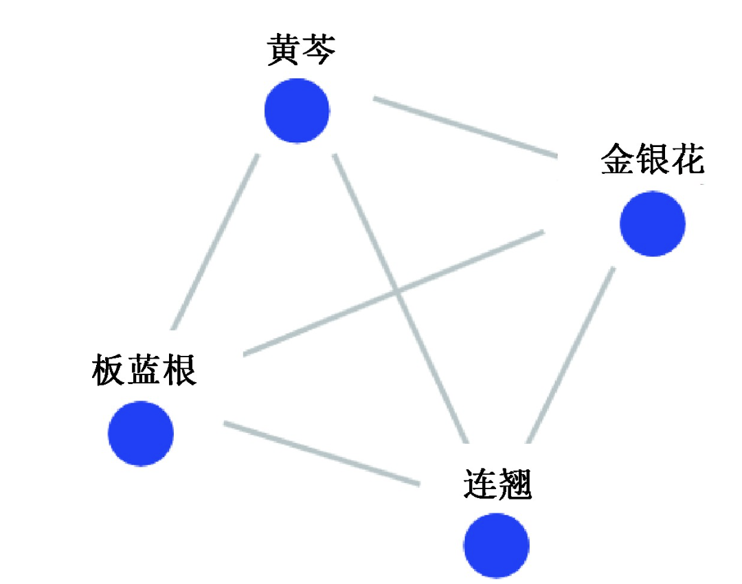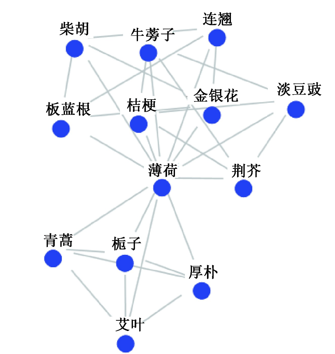 图2 治疗儿童感冒类中成药(风热感冒类)用药配伍模式网络图