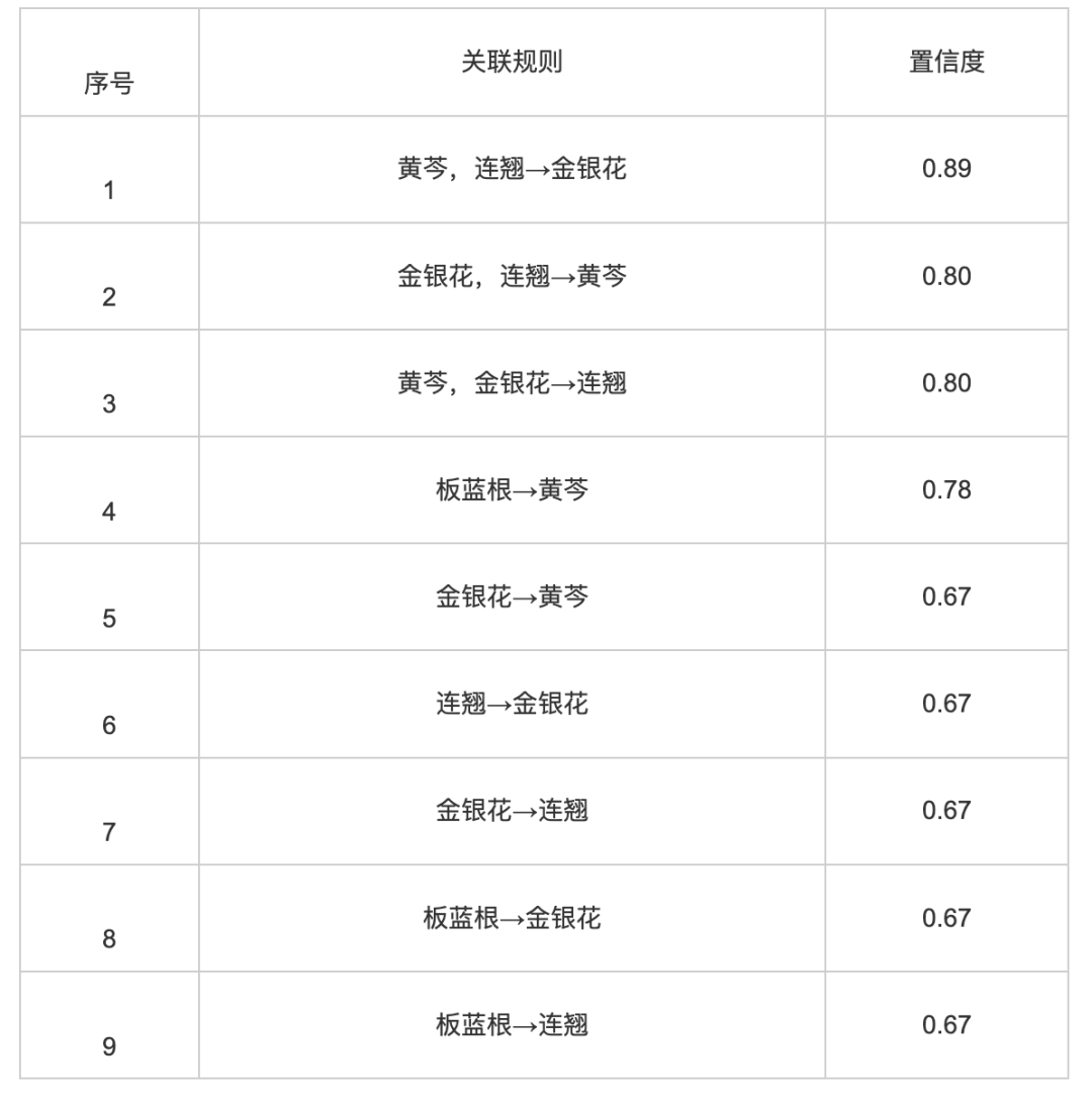 表6 治疗儿童感冒类中成药(风热感冒类)关联规则分析结果