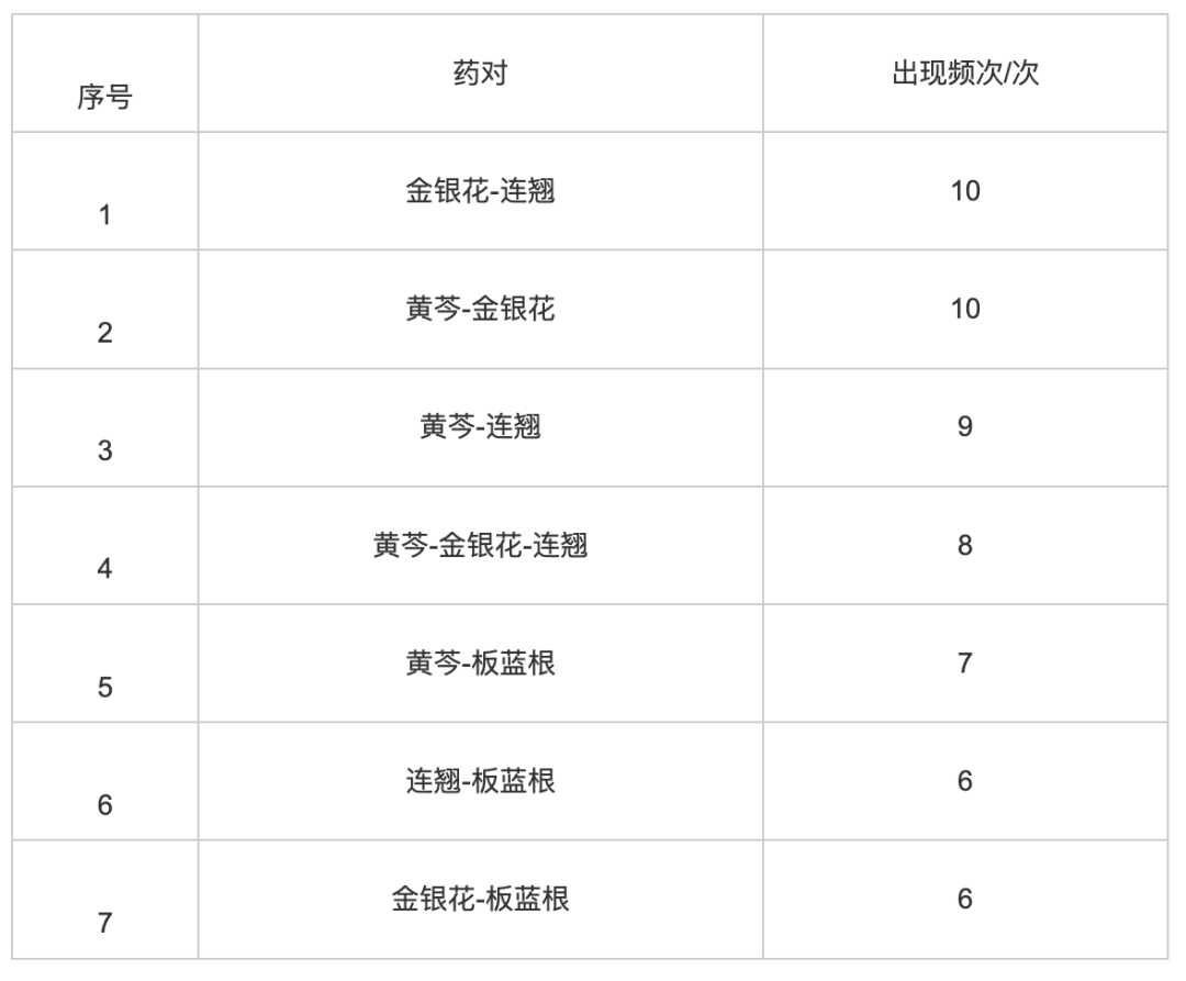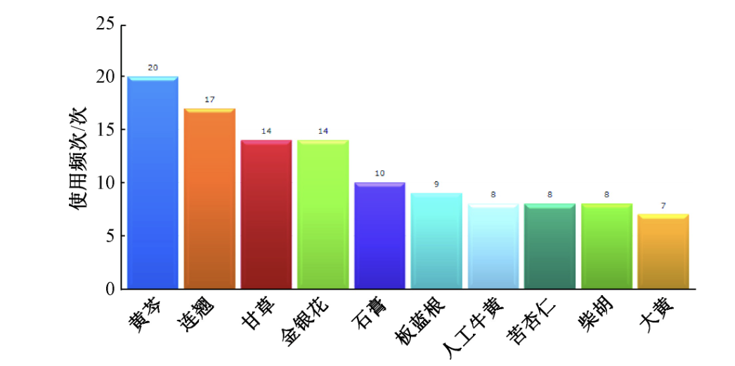 48种中成药中使用频次排名前10位的中药依次为黄芩、连翘、甘草、金银花、石膏、板蓝根、人工牛黄、苦杏仁、柴胡、大黄,具体见图1。