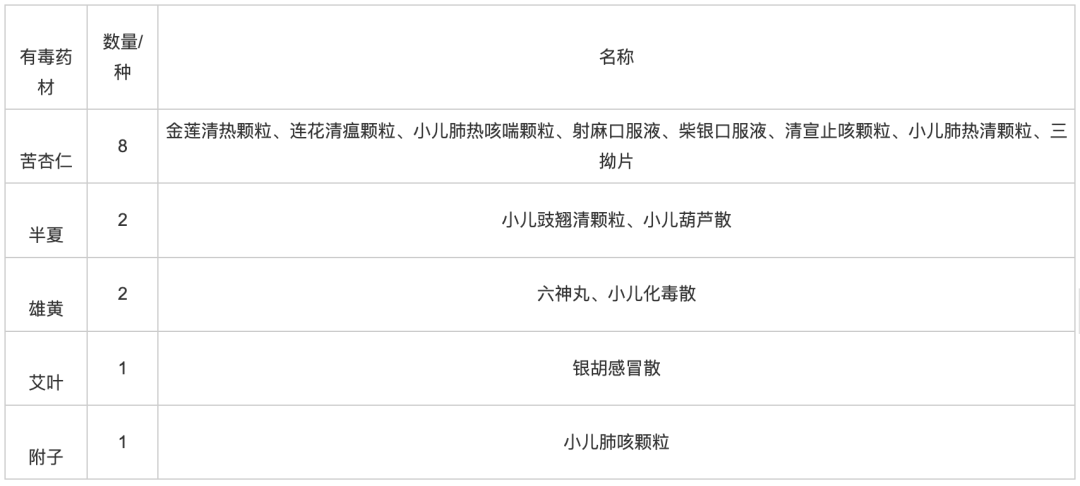 表9 含有毒药材治疗儿童感冒类中成药分布