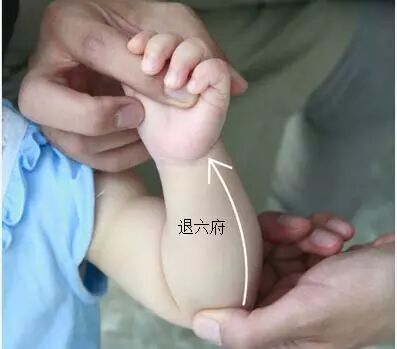六腑是前臂靠小手指那一侧的直线,从肘推向腕。这个穴位能退五脏六腑实热,如果宝宝烧到39.5以上,妈妈可以直接推这个穴位,尤其针对高烧不退,宝宝精神不好使用,效果更是明显。