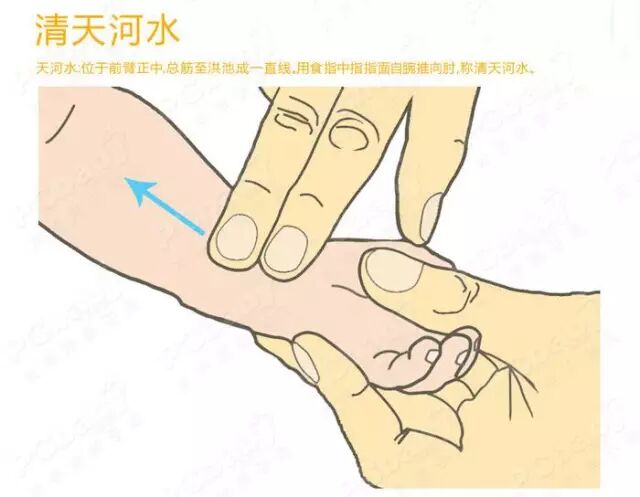 天河水位于前臂内侧正中线,自腕至肘呈一条直线。用食指和中指蘸取一些清水,由腕到肘,直推300-500次,名为清天河水。而打马过天河的方向和位置与天河水一致,不过操作手法是用食指和中指两指蘸水,然后从腕到肘方向在皮肤上敲打,发出类似小马过河,马蹄拍打水面的响声。(国务院响应推广绿色疗法小儿推拿中医育儿健康项目,同时建议中医专业院校开设小儿推拿课程,达到家家用上绿色疗法,学习关注本平台,联系小编。)