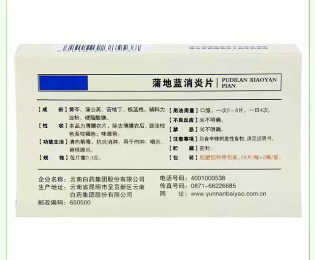 蒲地蓝消炎片——用于急性咽炎,咽红咽痛、扁桃体红肿(推荐使用云南白药牌,有效成分含量高)