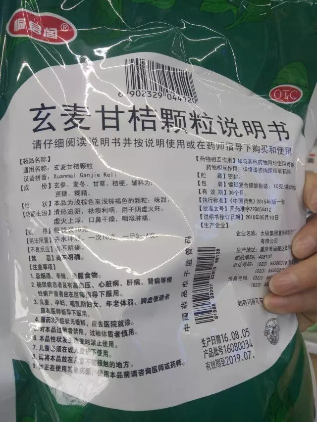 玄麦甘桔颗粒——用于阴虚火旺,如熬夜后,口鼻干燥、咽痛等