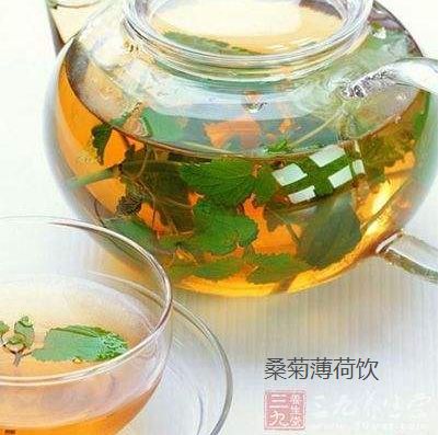 (2)桑菊薄荷饮:桑叶、菊花、薄荷、苦竹叶、蜂蜜少许,加适量水,煮沸,代茶频服。桑叶清肺热;菊花疏散风热,明目平肝;薄荷为疏散风热之要药,能迅速解除发热头痛等症状。有高血压或头痛、目糊之患者也较为适宜。