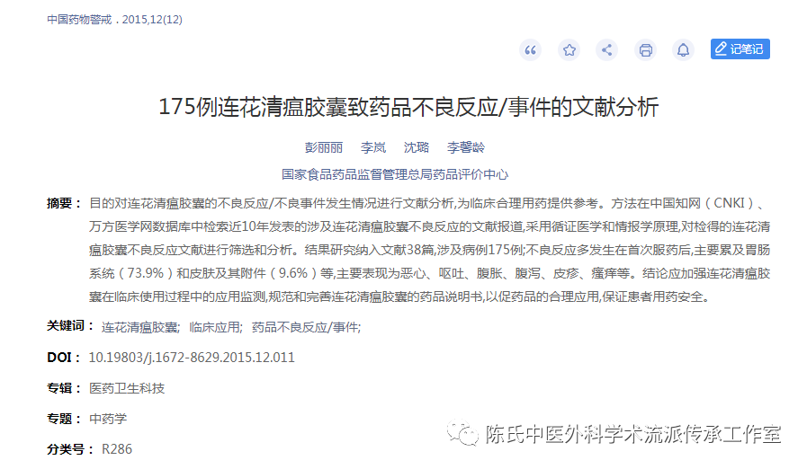 连花清瘟颗粒含有石膏、大黄等对于脾胃虚寒便溏、年老体弱等患者不利,且不宜长期使用。彭丽丽纳入38篇有关连花清瘟胶囊致药品不良反应情况进行文献分析,主要累及胃肠系统(73.9%)和皮肤及其附件(9.6%)等,主要表现为恶心、呕吐、腹胀、腹泻、皮疹、瘙痒等。