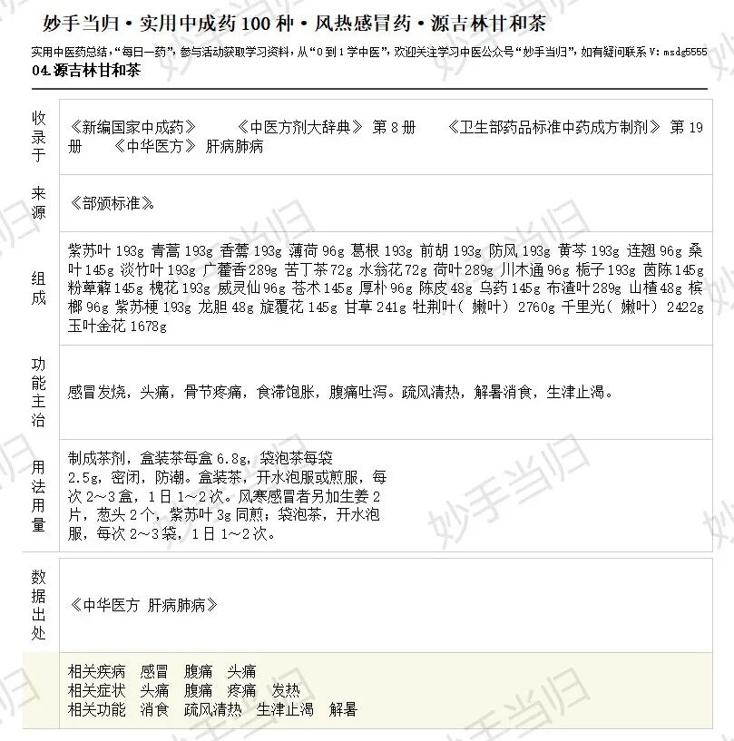 此外,风热感冒还可以用02.加味感冒丸,03.感冒解表丸,04.源吉林甘和茶。