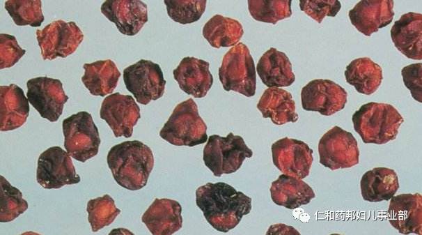 本品呈不规则的球形或扁球形,直径0.5-0.8cm。表面红色、紫红色或暗红色,皱缩,显油润。果肉柔软,有的表面具白霜;种子1-2枚,肾形,表面棕黄色,有光泽,种皮薄而脆。气微,果肉味酸;种子破碎后有香气,味辛、微苦。