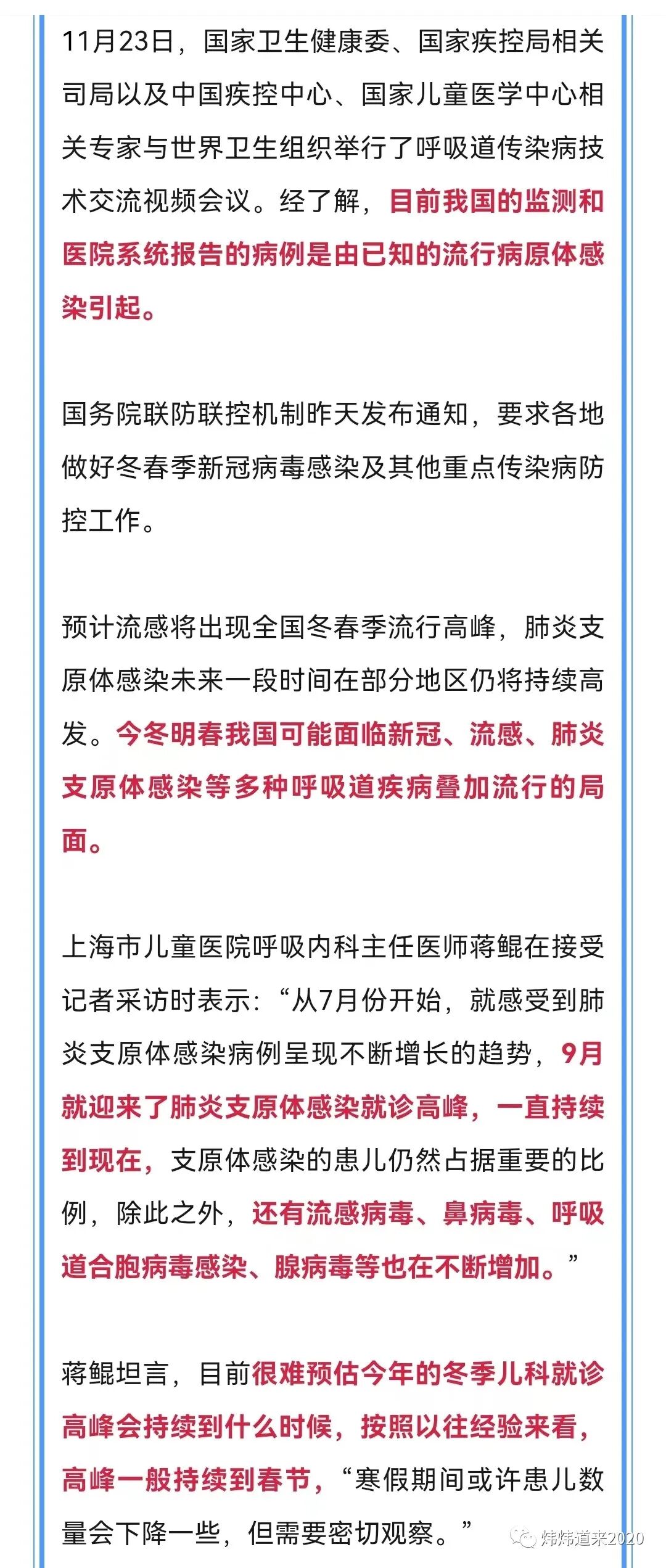 按照一些专家的看法,预计流感将出现全国冬春季流行高峰,肺炎支原体感染未来一段时间在部分地区仍将持续高发。今冬明春我国可能面临新冠、流感、肺炎支原体感染等多种呼吸道疾病叠加流行的局面。