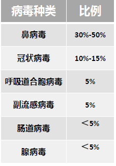 鼻病毒是最常见的病原体,细菌感染仅占呼吸道感染的10%,常见的病毒感染种类如下表: