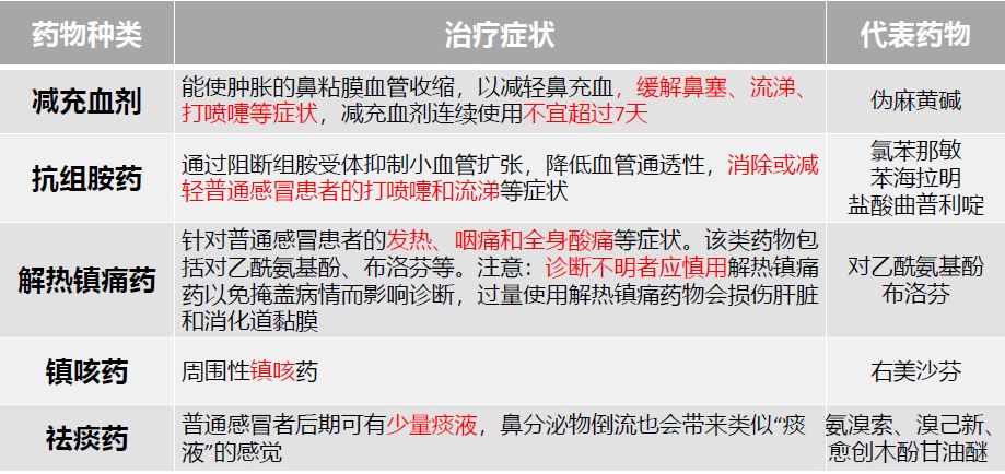 目前,尚无专门针对普通感冒的特异性抗病毒药物,无需全身使用抗病毒药物,病程早期应用利巴韦林气雾剂喷鼻咽部可能有一定益处。普通感冒的药物治疗应以对症治疗为主,通常包括:减充血剂、抗组胺药、解热镇痛药、镇咳药、祛痰药,以及中药。