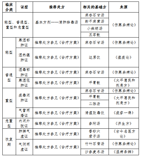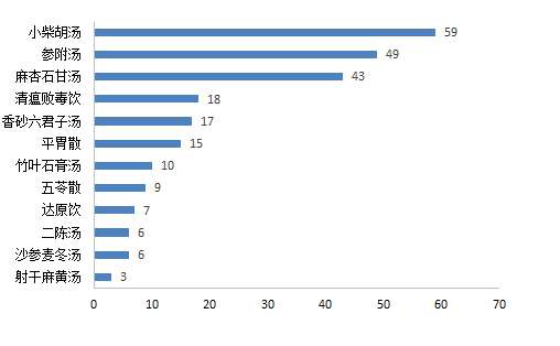 对于临床治疗期的推荐处方,《诊疗方案》给出了10首推荐处方(其中1首基本方剂)和8个中药注射剂,报告通过分析基本方剂和各推荐处方的组方架构,发现其基础方分别源自12首中医古代经典方,也就是说这些推荐处方均为根据中医经典方演化而成。