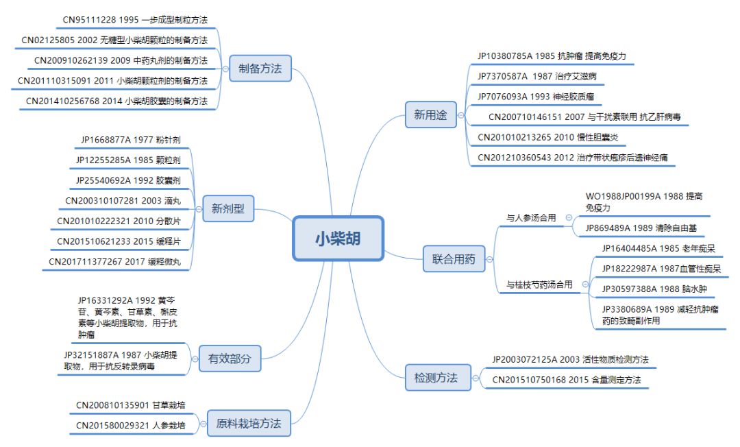 小柴胡汤源自《伤寒杂病论》,具有和解少阳,调和气血,扶正祛邪之功效,常用于风寒感冒。现代研究表明小柴胡汤具有抗病毒、调节机体免疫功能等作用。与小柴胡汤相关的59项专利申请信息,包括制备方法、剂型、制药用途、有效部位、检测方法、联合用药、原料药栽培方法等方面的研究和开发。抗病毒方面,CN200710146151通过对照试验证实了小柴胡汤具有抗乙肝病毒作用,其它申请还揭示小柴胡汤具有抗炎、提高免疫力的作用。建议后续研发进一步加强对麻杏石甘汤和小柴胡汤在作用机制和抗新冠病毒方面的深入研究。