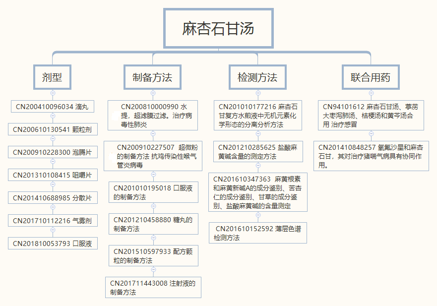 根据专利申请信息的显示,这些经典方中,具有抗病毒作用的经典方包括麻杏石甘汤、小柴胡汤、达原饮和清瘟败毒散。麻杏石甘汤源自《伤寒杂病论》,为解表清热、宣肺平喘要方,临床常用于治疗呼吸道疾病。与麻杏石甘汤相关的43项专利申请信息表明,其抗病毒作用主要表现为治疗病毒性肺炎、流感和动物呼吸道病毒感染。