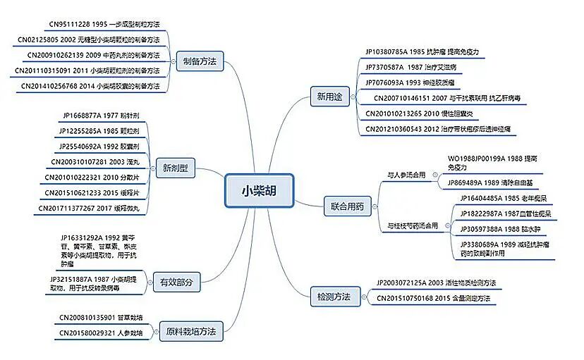 小柴胡汤源自《伤寒杂病论》,具有和解少阳,调和气血,扶正祛邪之功效,常用于风寒感冒。现代研究表明小柴胡汤具有抗病毒、调节机体免疫功能等作用。与小柴胡汤相关的59项专利申请信息,包括制备方法、剂型、制药用途、有效部位、检测方法、联合用药、原料药栽培方法等方面的研究和开发。抗病毒方面,CN200710146151通过对照试验证实了小柴胡汤具有抗乙肝病毒作用,其它申请还揭示小柴胡汤具有抗炎、提高免疫力的作用。建议后续研发进一步加强对麻杏石甘汤和小柴胡汤在作用机制和抗新冠病毒方面的深入研究。