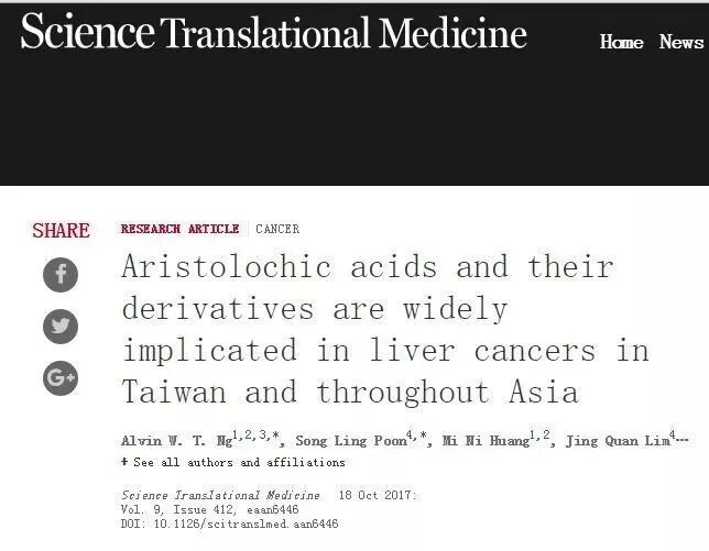 近日,一篇题为《台湾和亚洲地区的肝癌与马兜铃酸及其衍生物广泛相关》的文章在著名医学期刊《Science Translation Medicine》上发表。