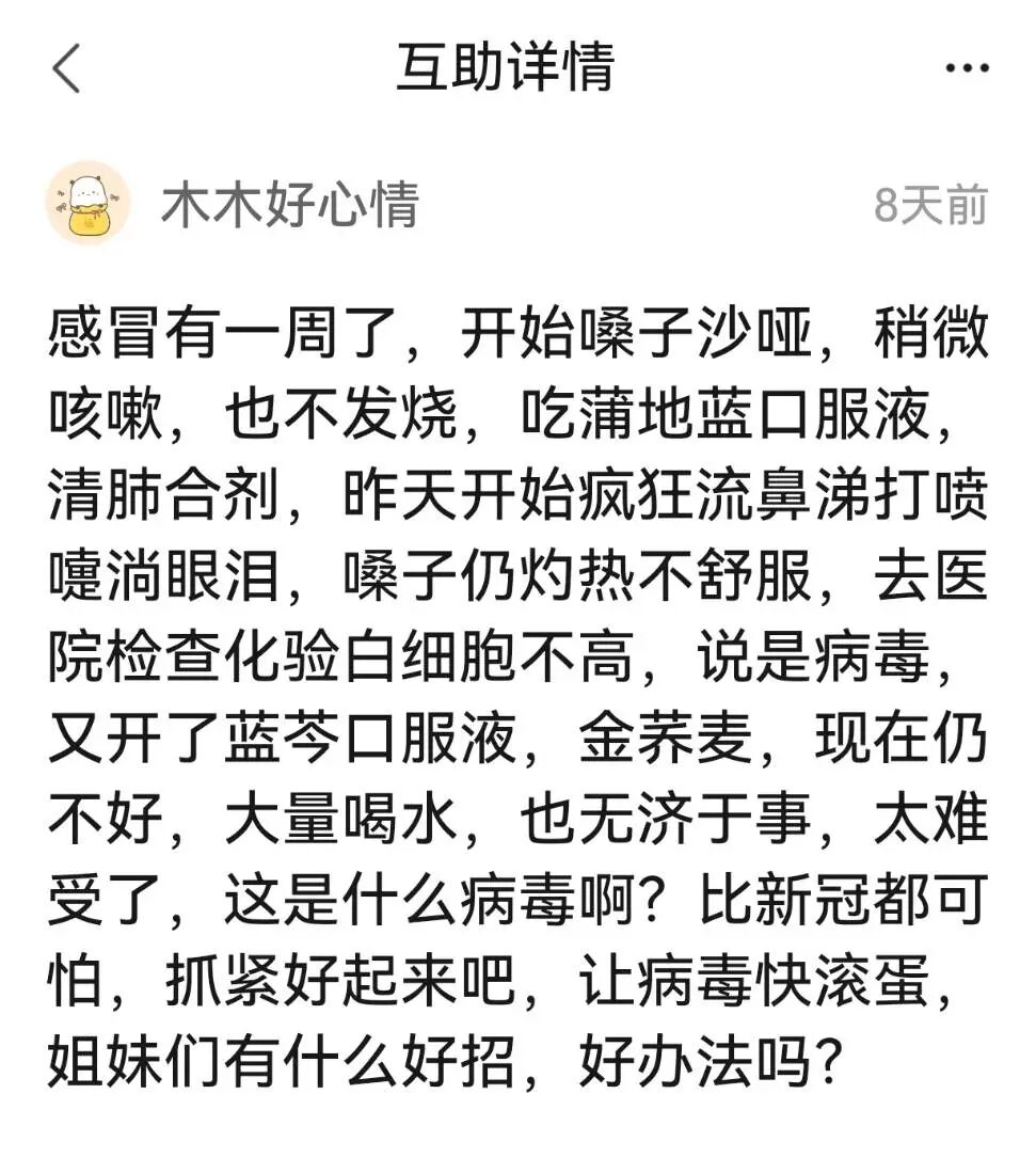 就在前几天,觅友木木好心情也表示自上周开始感冒,一开始喉咙嘶哑并伴有轻微咳嗽,但未出现发热情况。期间,她服用了蒲地蓝口服液以及清肺合剂等药物。没想到症状却加剧,出现了流鼻涕、打喷嚏和流泪、咙灼热。在医院里进行了相关检查后,被诊断为病毒感染性感冒。随后,服用了医生开具的蓝芩口服液和金荞麦片,但至今病情仍未见明显好转。