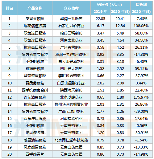 2020年中国城市零售药店中成药感冒用药TOP20厂家市场格局预测