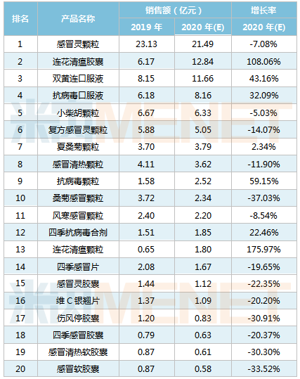 中国城市零售药店终端中成药感冒用药产品TOP20