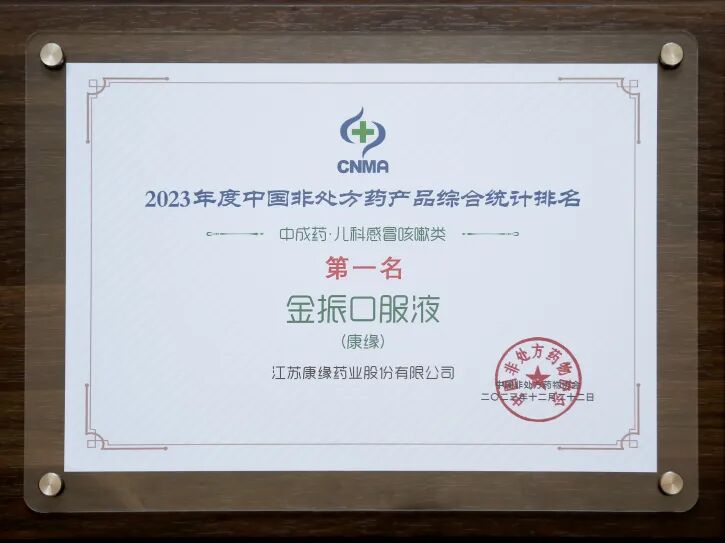 点赞!金振口服液荣获2023年度中国非处方药产品综合统计排名中成药·儿科感冒咳嗽类第一名