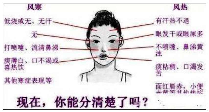 感冒常以风邪兼挟寒或热而发病,因此临床上应首先分清风寒、风热两证。二者均有恶寒、发热、鼻塞、流涕、头身疼痛等症,其不同之处:风寒者,恶寒重、发热轻、无汗、鼻流清涕、口不渴、舌苔薄白、脉浮或浮紧;风热者,发热重、恶寒轻、有汗、鼻流浊涕、口渴、舌苔薄黄、脉浮数。