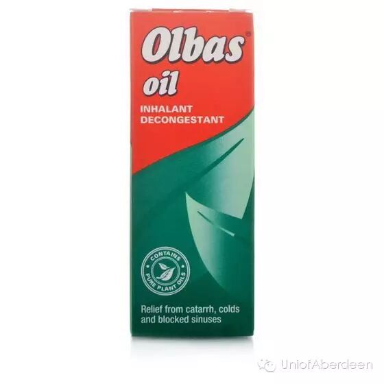 这个Olbas oil,比较像国内的清凉油。用来缓解鼻塞,流鼻涕的症状很管用。它里面含有Menthol(薄荷醇),Peppermint oil(薄荷油)等成分。使用时涂抹在胸前,喉咙下和背后,靠挥发产生的气体来缓解鼻塞流涕等症状。