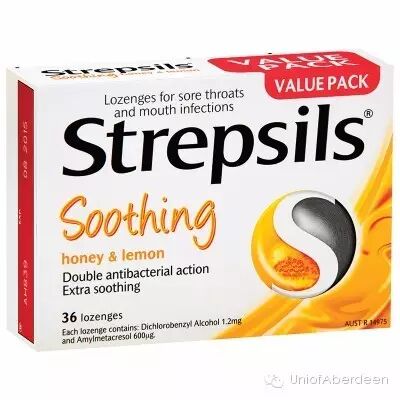 Strepsils的润喉糖有抗菌成分,味道是柠檬加蜂蜜味的。