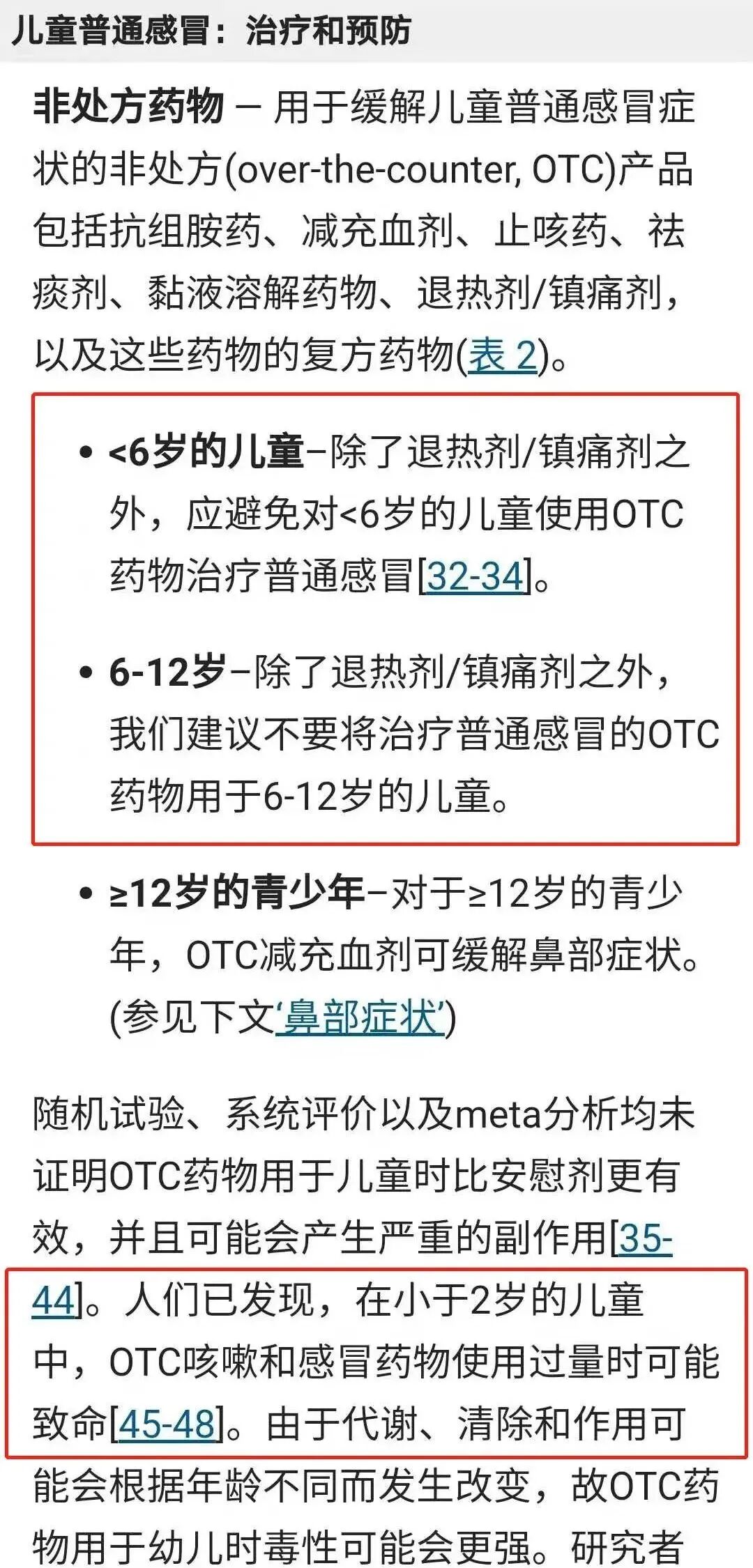 UpToDate的建议同样,但在年龄上有所扩大,不建议6岁以下儿童服用复方感冒药。
