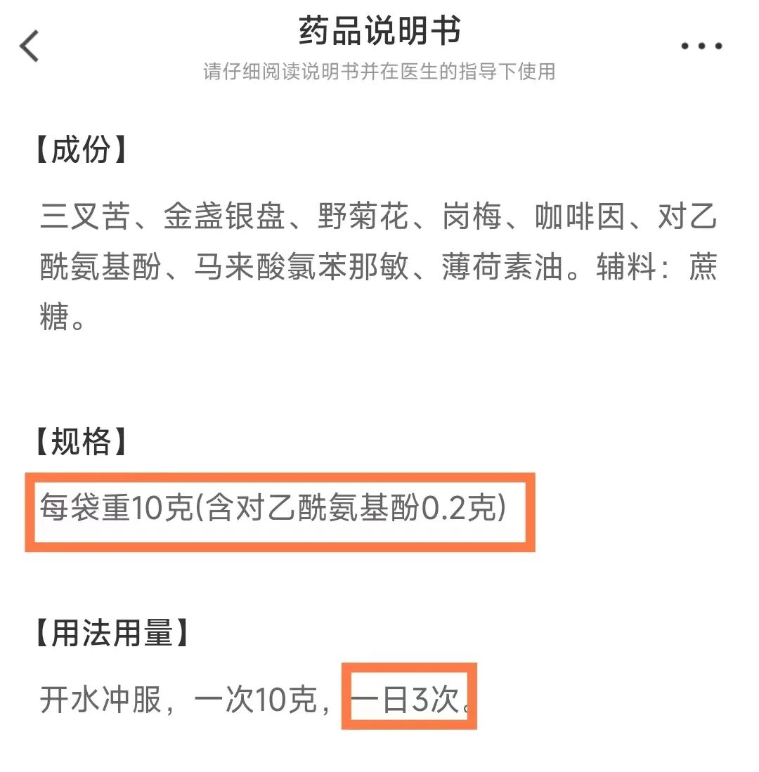 比如下图中的复方感冒药,每袋含有对乙酰氨基酚0.2克,一天吃3次,每次1袋,那一天就吃了对乙酰氨基酚0.6克。