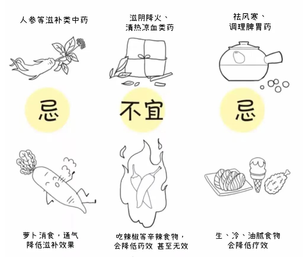 中成药不同于西药,它是通过多组分多靶点作用于人体,整体调节而达到治疗的目的。一般来说,服用中成药期间不宜进食生冷、油腻、腥膻、辛辣等有刺激性的食物。