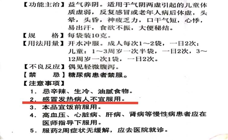 如补益药槐杞黄颗粒的说明书注意事项一栏有明确标注:感冒发热病人不宜服用。