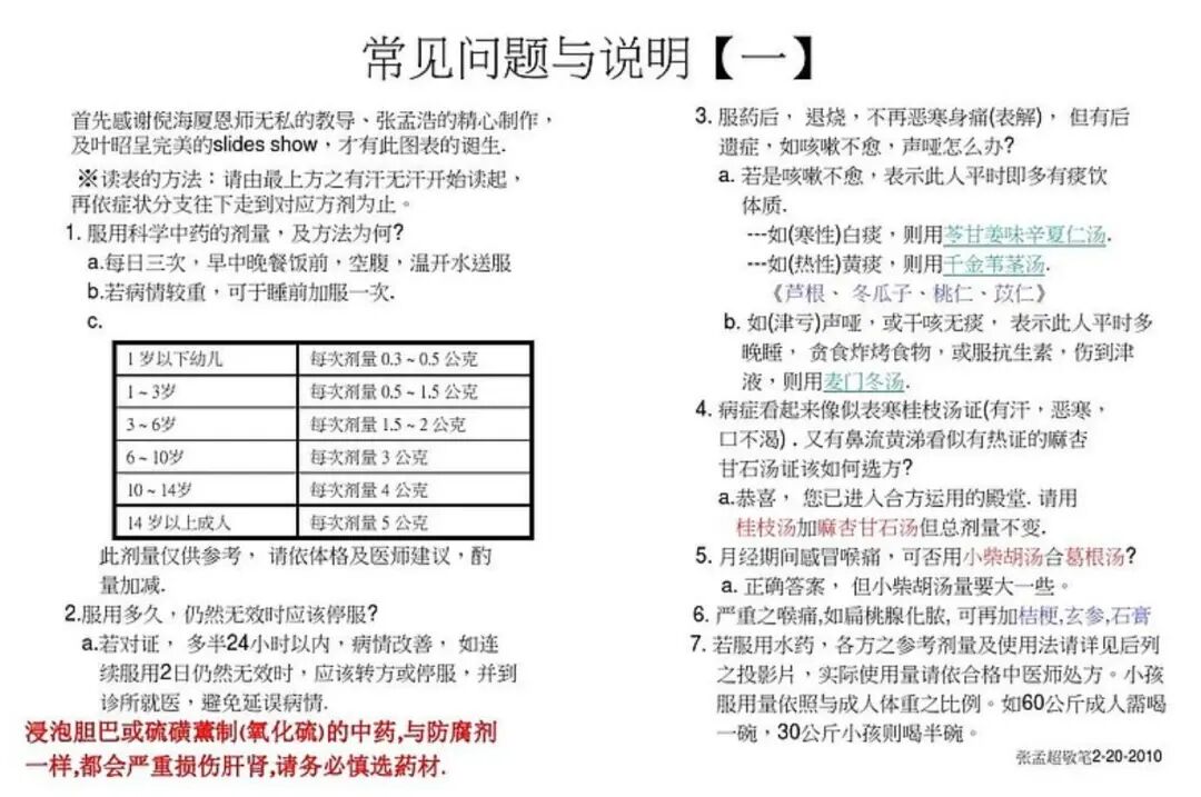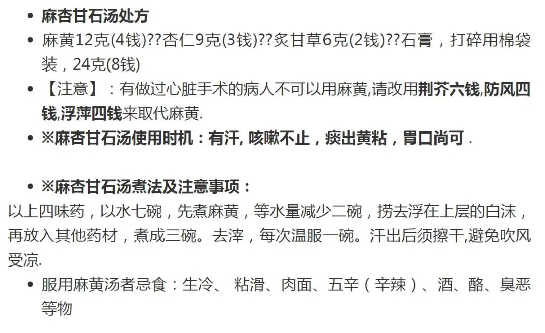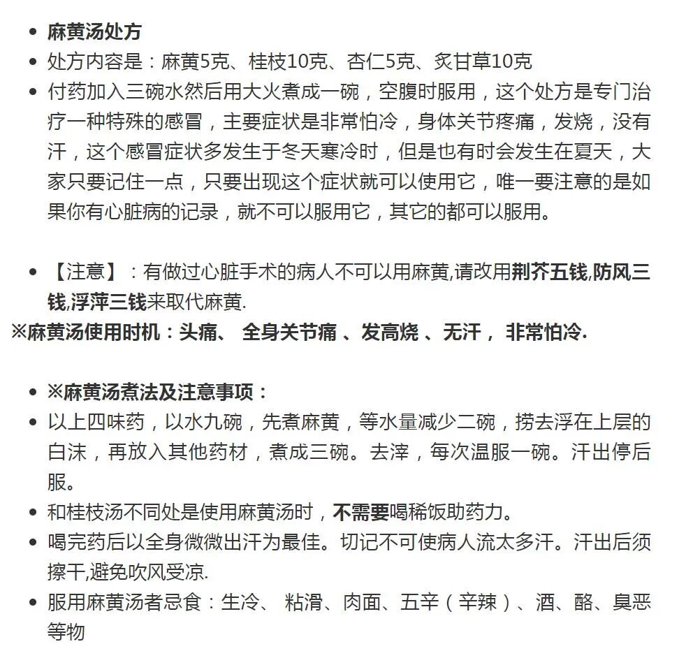 【注意】:有做过心脏手术的病人不可以用麻黄,请改用荆芥六钱,防风四钱,浮萍四钱来取代麻黄.