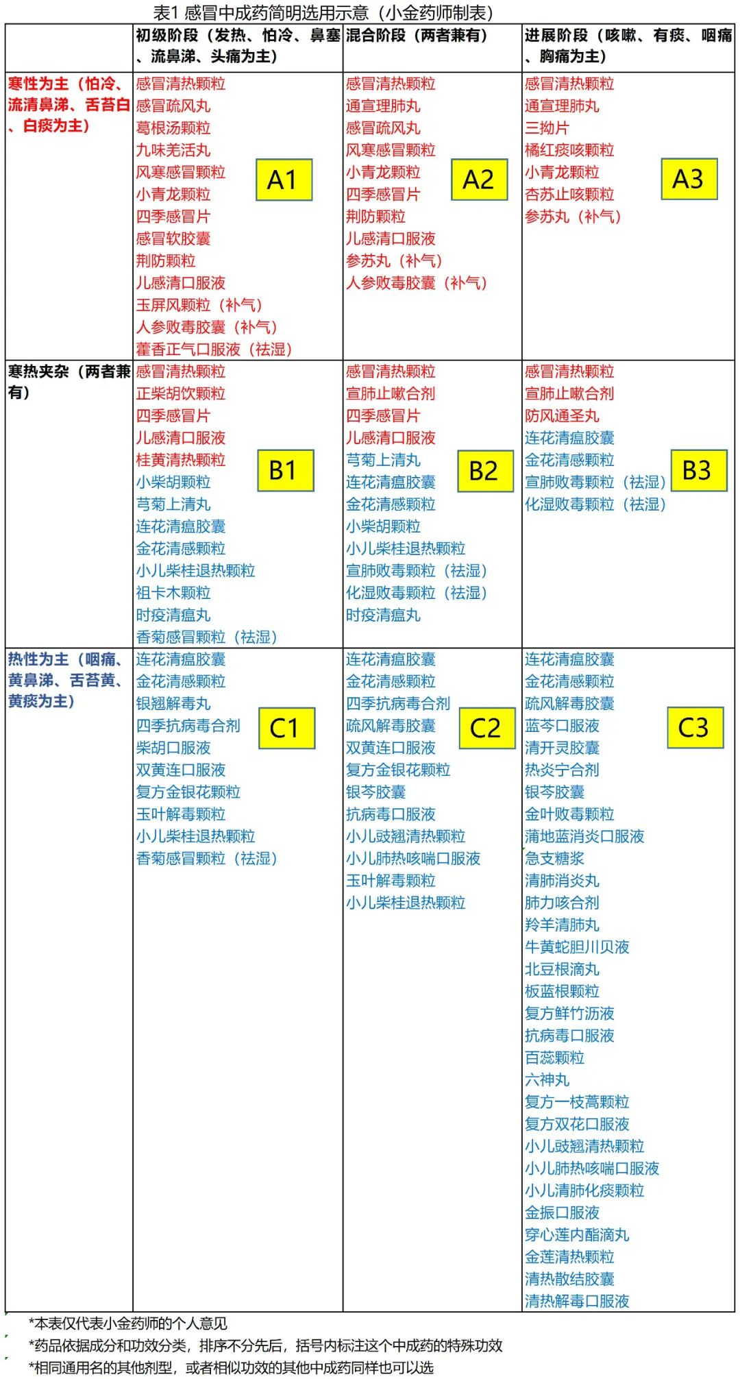 通过这二步,就可以确定下表中的一个区域。这个区域内的中成药,就是建议选用的感冒中成药。