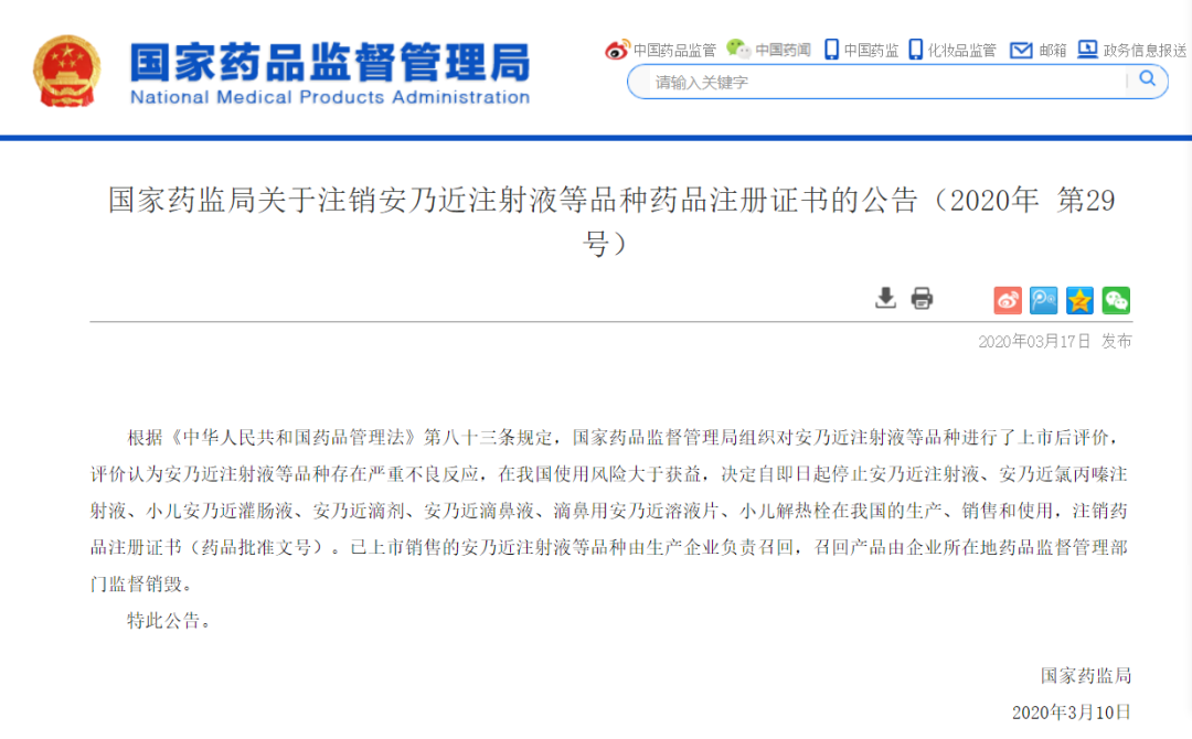 安乃近用于急性高热,其退热作用强,易致患者大汗淋漓,甚至发生虚脱,长期应用可能引起粒细胞缺乏症、血小板减少性紫癜、再生障碍性贫血。由于该药可导致上述严重血液系统不良反应,且目前有更为安全的退烧药(如对乙酰氨基酚、布洛芬)可供选择,目前在美国、日本等三十多个国家已被淘汰。今年3月17日,国家药品监督管理局发布公告停止安乃近注射液、安乃近滴剂、小儿解热栓等品种的生产、销售和使用,并修订了安乃近片、重感灵片以及复方青蒿安乃近片的说明书,指出18岁以下禁用,且不作为首选用药。服用含安乃近成分中成药时,患者一定不能自行增加剂量,也不能长期使用。成年人每次0.5~1g,最大日剂量3g。
