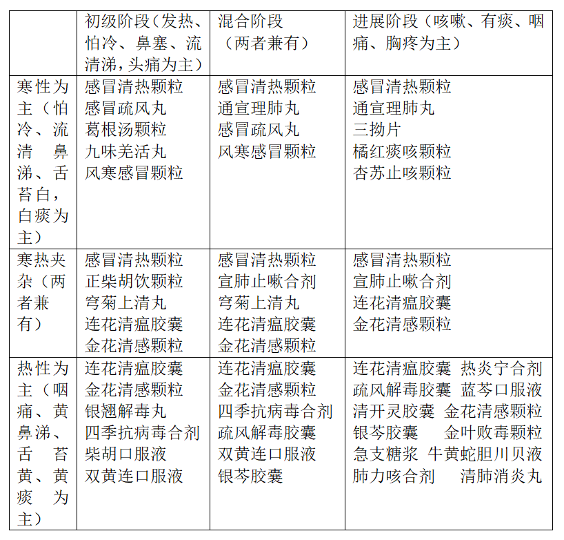 根据外感病的寒热属性和进展阶段列了药物选用的框架表,根据成分和功效,任何感冒类中成药都可以列入框架表中,表中仅列出部分供参考,大家根据寒热属性和疾病进展阶段也可以选用其它对症药物。所有的感冒类中成药都可以用于新冠、甲流、乙流等外感病,关键要对症。与其去选用一两种推荐的或缺货易断货的品种,不如选用当地常用的感冒类中成药。