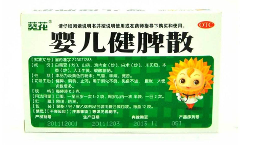 主要成分是白扁豆(炒)、山药(炒)、鸡内金散(炒)白术(炒)、川贝母、木香、碳酸氢钠、人工牛黄辅料为蔗糖、香橙香精、甜菊糖昔。